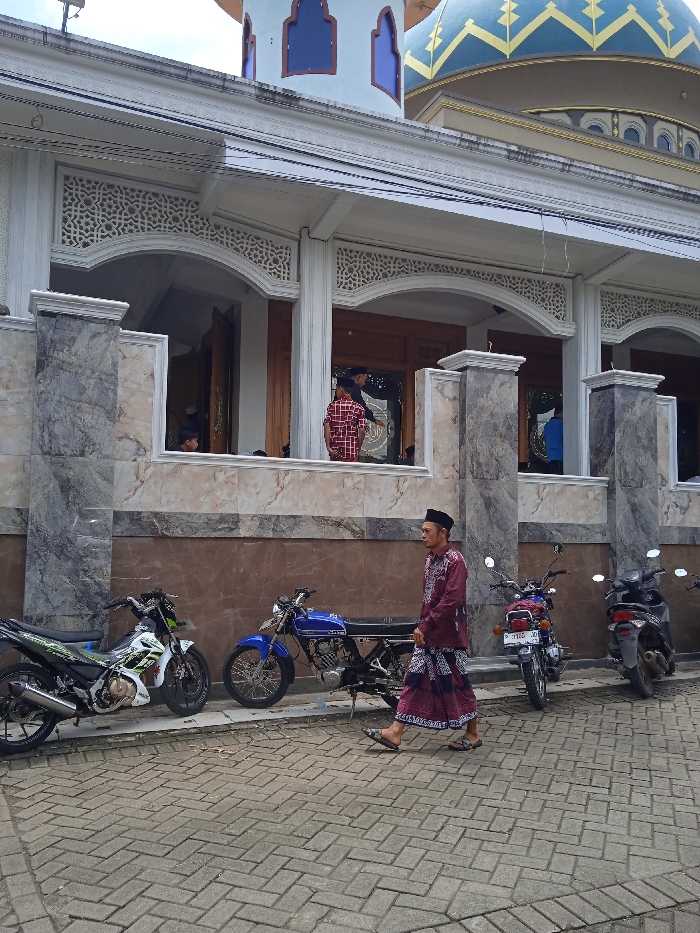 A man in a maroon shirt, sarong, and black cap walks past parked motorcycles in front of a building with a blue and gold dome. The building has arched windows with decorative trim and marble pillars. People are visible inside, looking out. The ground is paved with gray bricks.