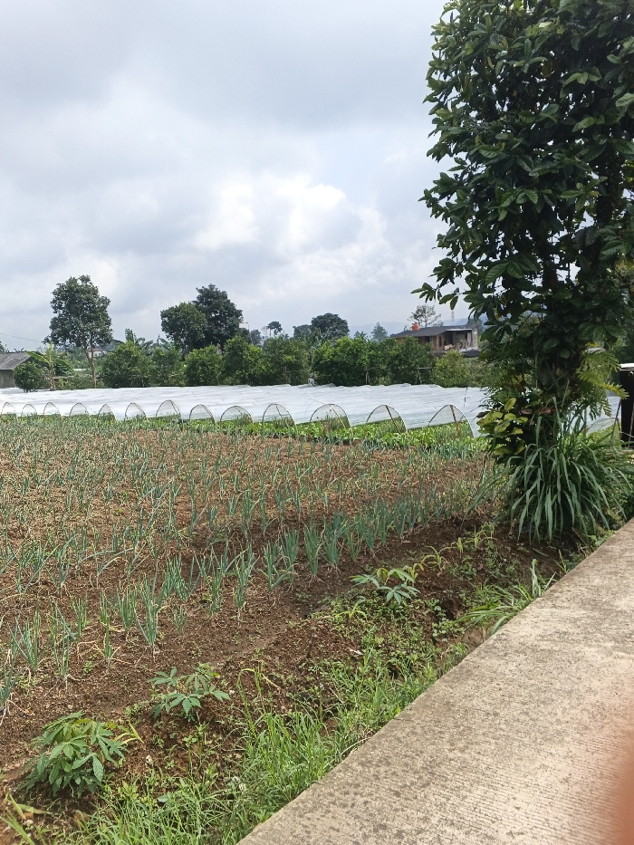 A cultivated field displays neat rows of young scallions against rich brown soil. In the background, a series of white, arched structures presumably cover other crops. Scattered trees and a building with a red roof dot the horizon under a cloudy sky. A tall tree with dark green leaves anchors the right side, accompanied by grassy foliage. A concrete ledge runs along the bottom of the image.
