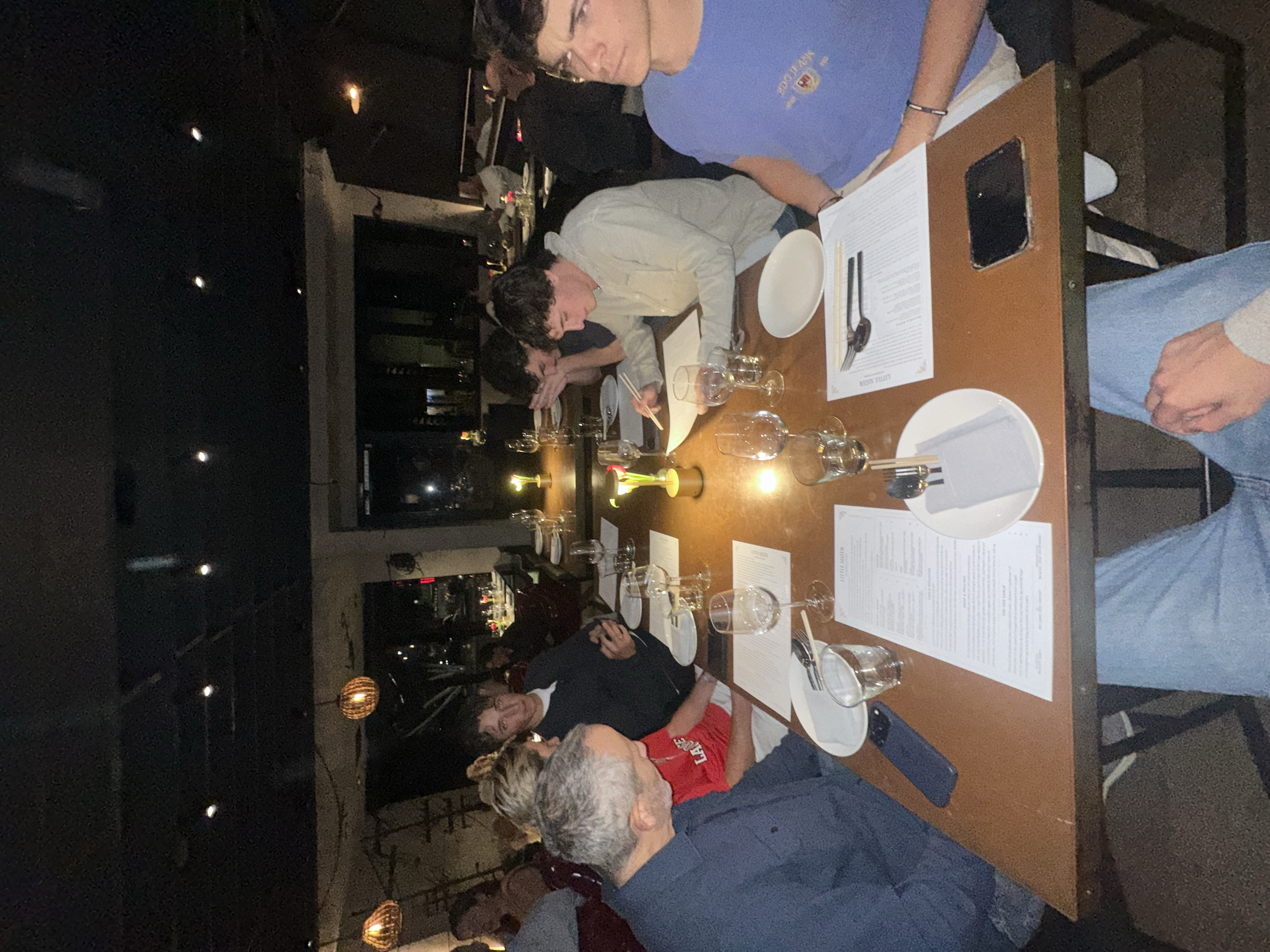 A group of people are sitting at a long table in a dimly lit restaurant. The table is set with plates, silverware, wine glasses, and menus. A few decorative centerpieces sit on the table. People are dressed casually. Some are looking at menus and others are talking. A dark-colored smartphone sits at the top of the table. Overhead, decorative lights hang from the ceiling. Outside, city lights are visible through a window.