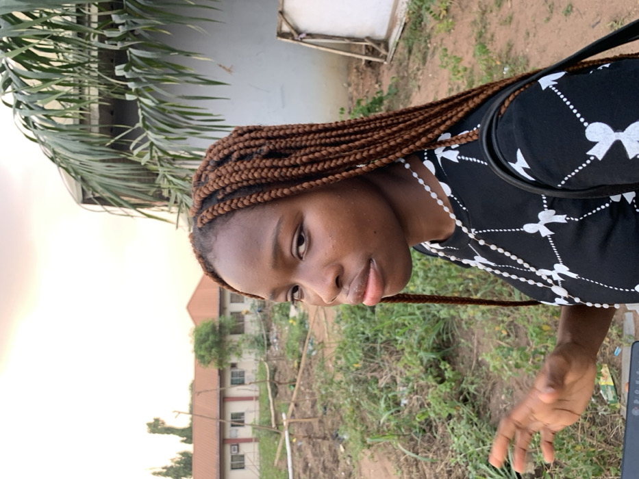 A young Black female stands outdoors in Ihiagwa, Nigeria, with her body angled slightly to the right of the frame, looking back over her left shoulder towards the camera