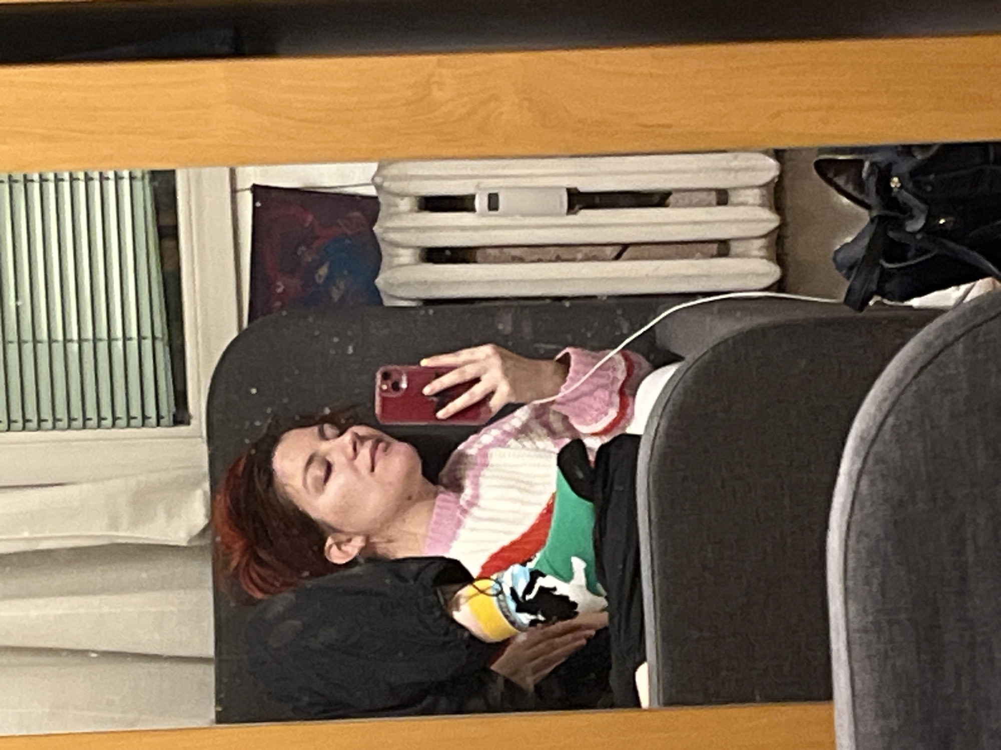 The image depicts a mirror reflection of an individual seated indoors, taking a selfie with a red smartphone. The person, appearing female, has reddish-brown hair tied up, and is wearing a multi-colored striped sweater (pink, white, cream) with ruffled cuffs, black lower garments, and patterned socks featuring green, yellow, blue, black, and white colors. A white cable is visible near the phone. In the background reflection, behind the individual, a window with closed horizontal blinds and sheer white curtains is visible. Below the window, a white cast-iron radiator with a white thermostatic valve attached to one of its segments is present. To the left of the radiator, a dark-toned tapestry or poster with abstract red and blue elements is pinned to the wall. On the floor to the right of the radiator, a dark bag, possibly a backpack, is discernible. The immediate foreground shows the dark upholstery of the furniture the individual is seated on. The overall environment suggests a residential interior in Sofia, Bulgaria, consistent with typical central heating systems and window configurations found in the city.