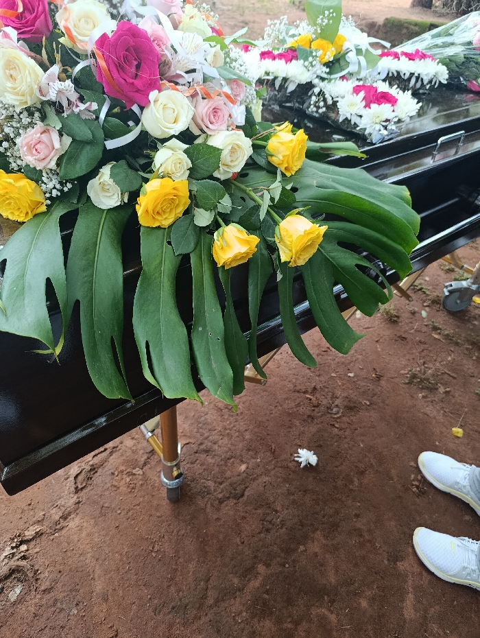 The scene depicts a black polished casket situated outdoors on reddish-brown earth in Muthetheni ward, Kenya. A large, elaborate floral arrangement adorns the casket's upper surface, predominantly featuring white, pink, yellow, and fuchsia roses, accented by white alstroemeria, baby's breath, and scattered orange and white ribbons. Several large green monstera leaves are laid beneath the main arrangement, with additional yellow roses placed individually along their length. Further down the casket, another floral arrangement containing white and pink chrysanthemums with yellow accents is visible. The casket rests on a metallic stand, with a gold-colored leg and a wheel partially visible. On the ground, a single fallen white flower and small debris are present. The lower legs and feet of an individual, wearing white athletic shoes, are visible in the bottom right foreground.