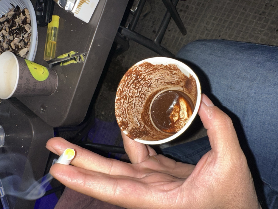 A person holds a cigarette in one hand and a paper cup with remnants of Turkish coffee in the other
