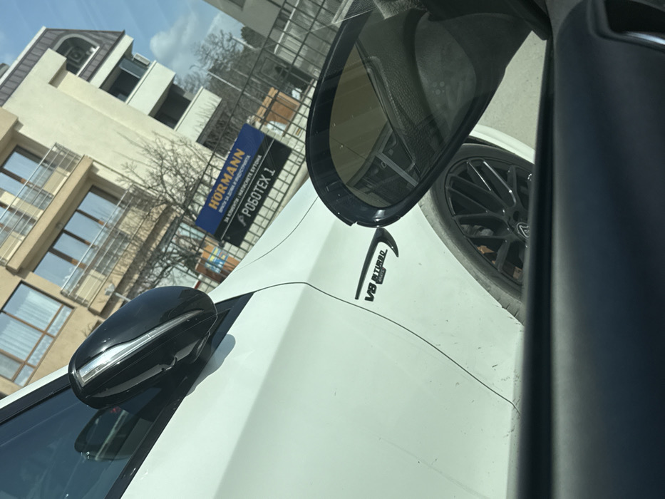 The image depicts a daytime scene from within a vehicle, looking towards its right side. In the midground, the driver's side of a white Mercedes-AMG vehicle is prominently featured, identifiable by a "V8 BITURBO 4MATIC+" badge on its front fender. The vehicle exhibits some dirt along its lower body panels and wheel arch. Its black side mirror with an integrated indicator light is visible, as is a black multi-spoke alloy wheel. In the immediate foreground, the dark interior trim and the viewer's vehicle's side mirror partially obstruct the view. In the background, beyond the white vehicle, a commercial sign is visible. The upper portion of the sign is blue and displays "HORMANN" in large white letters, with smaller Bulgarian text beneath: "ВРАТИ ЗА ДОМА И ИНДУСТРИЯТА" (Gates for Home and Industry). The lower black section of the sign features "ROBOTEX 1" in white letters, preceded by "ЗА КЛИЕНТИ И МАТЕРИАЛИ БУТОНИ". Behind the sign, a multi-story building with a light-colored facade, numerous windows, and balconies is present. Bare deciduous trees are scattered in the mid-distance. The sky is bright blue with minimal cloud cover. This scene is located in Varna, Bulgaria, indicated by the specific Bulgarian text on the commercial sign and the presence of "ROBOTEX 1", a known Hormann dealer operating in the Varna region.