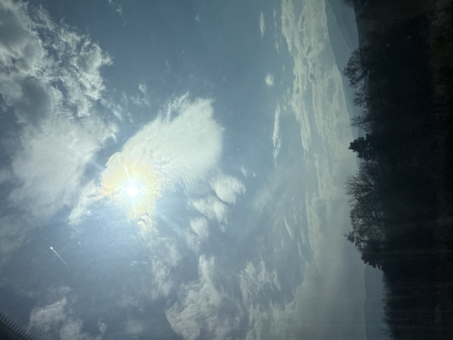 The image displays a rural landscape captured under bright daylight conditions in the vicinity of Skravena, Bulgaria. The upper two-thirds of the frame are dominated by a sky featuring scattered clouds, ranging from wispy to more substantial formations, against a light blue backdrop. The sun is visible in the upper-left quadrant, partially obscured by clouds, emitting a strong light that produces a distinct lens flare effect. The lower third of the image presents a dark, silhouetted band of dense vegetation, primarily consisting of leafless deciduous trees and some evergreen conifers, forming a prominent tree line. Beyond this tree line, hazy, blue-gray mountains or hills are visible in the distant background. No individuals, specific man-made objects, or discernible actions are present within the scene.