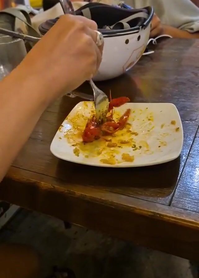 person using a fork to pick at the remains of a crawfish dish on a white plate. The plate is on a dark wooden table. A woman in a patterned shirt laughs while filming. Behind her is a poster advertising Singapore sauce crab. In the background, another person is slumped over the table with their head resting in what appears to be a motorcycle helmet. The scene is in a restaurant setting.