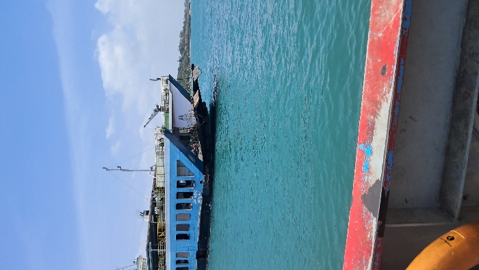 The image depicts an aquatic scene in the Ganjoni/Shimanzi ward, Mombasa, Kenya. A large, multi-decked blue and white vehicular ferry, bearing the hull number "JA 006" on its side, occupies the midground. The ferry's bow ramp is visible in a raised position, and several individuals are discernible on its upper deck. Masts and other maritime equipment are present on the upper structure. The ferry floats on calm, turquoise-blue water. In the distance to the right, a low-lying landmass covered in green vegetation is visible. The sky is partly cloudy blue. The foreground shows a weathered red and white railing with chipped paint, from which the photograph appears to have been taken, and a partial orange object, possibly a lifebuoy or fender, on the lower left. The ferry appears to be in motion or stationary in open water, not actively engaged in docking or loading procedures.