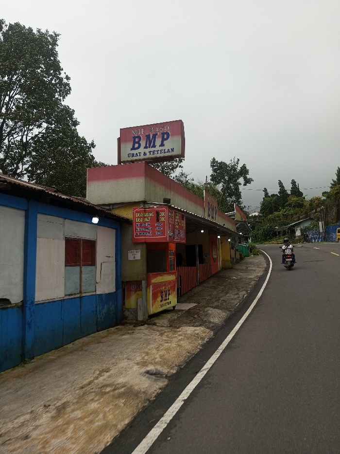 The image depicts a roadside scene in Bangtsho, Bhutan, under an overcast sky. On the left, a series of low-rise commercial structures line the edge of an asphalt road. The leftmost building has a corrugated metal roof and a facade painted in blue on the lower half and white on the upper, featuring a red-framed window. Adjacent to it stands a structure topped by a prominent red and white sign displaying "MIE BASO BMP URAT & TETELAN". Below this, smaller red signs with white text list menu items and prices in Indonesian, such as "BASO DAGING 5.000" and "MIE AYAM BASO 8.000". These buildings have small, bright white lights affixed to their exterior. An unpaved, uneven dirt and concrete path separates the buildings from the road. The asphalt road, marked by a solid white line along its right edge, curves gently to the right and recedes into the distance. In the mid-ground on the road, a single individual is observed riding a dark-colored scooter. The rider is wearing a light-colored, possibly striped, short-sleeved top and dark pants. Beyond the road and buildings, the landscape consists of densely treed hills under the cloudy, grey sky. Green foliage is also visible directly behind the buildings on the left. A small yellow object is partially visible on the far right side of the road in the distance.