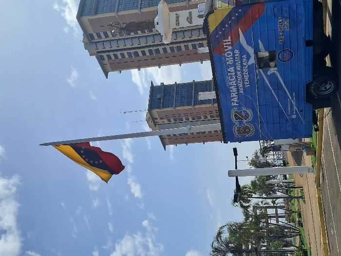Venezuelan flag waving in front of tall buildings under a blue sky with scattered clouds. To the right, a blue truck is parked, decorated with the words "Farmacia Movil Aviación Militar Venezolana" and the logo "Bricomiles Salud". The environment includes trees and a paved area, suggesting an urban or park setting. The photograph is taken from a low angle.