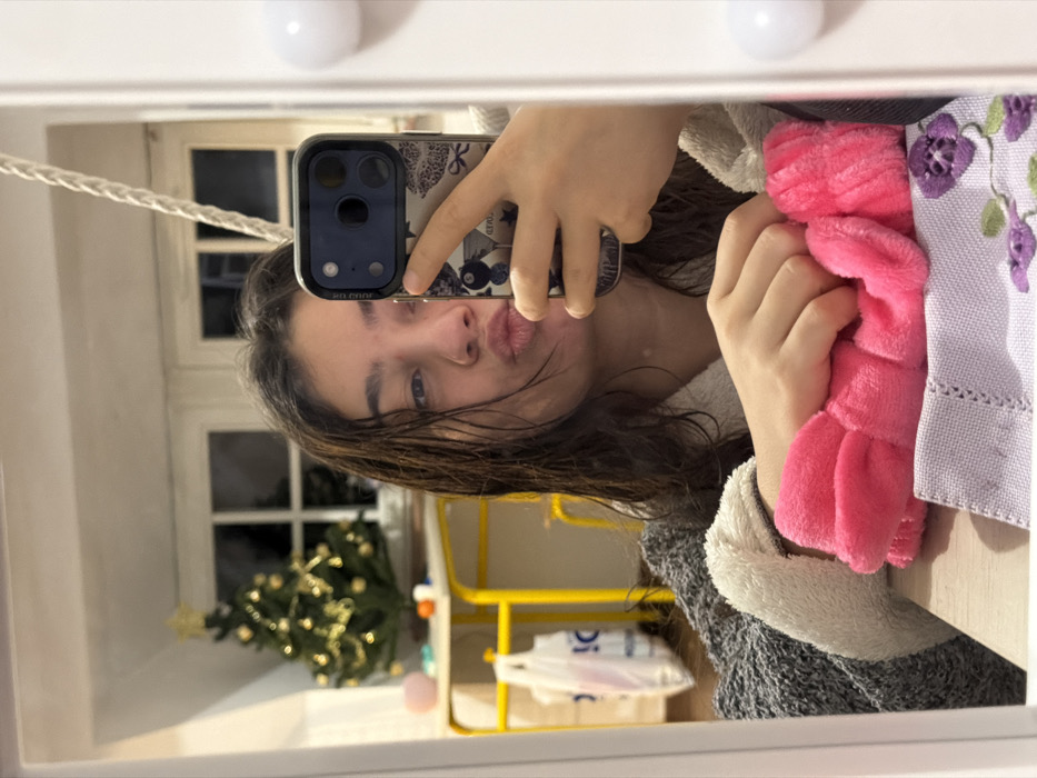 A person takes a mirror selfie, holding a phone with a blue case. They have dark hair, slightly wet, and are wearing a cozy-looking gray and white sweater. The background reflection includes a Christmas tree with lights, a yellow desk, and a window. A pink headband and a floral cloth are held in the person's other hand, partially obscuring their outfit. Three light bulbs are visible along the top of the mirror frame.