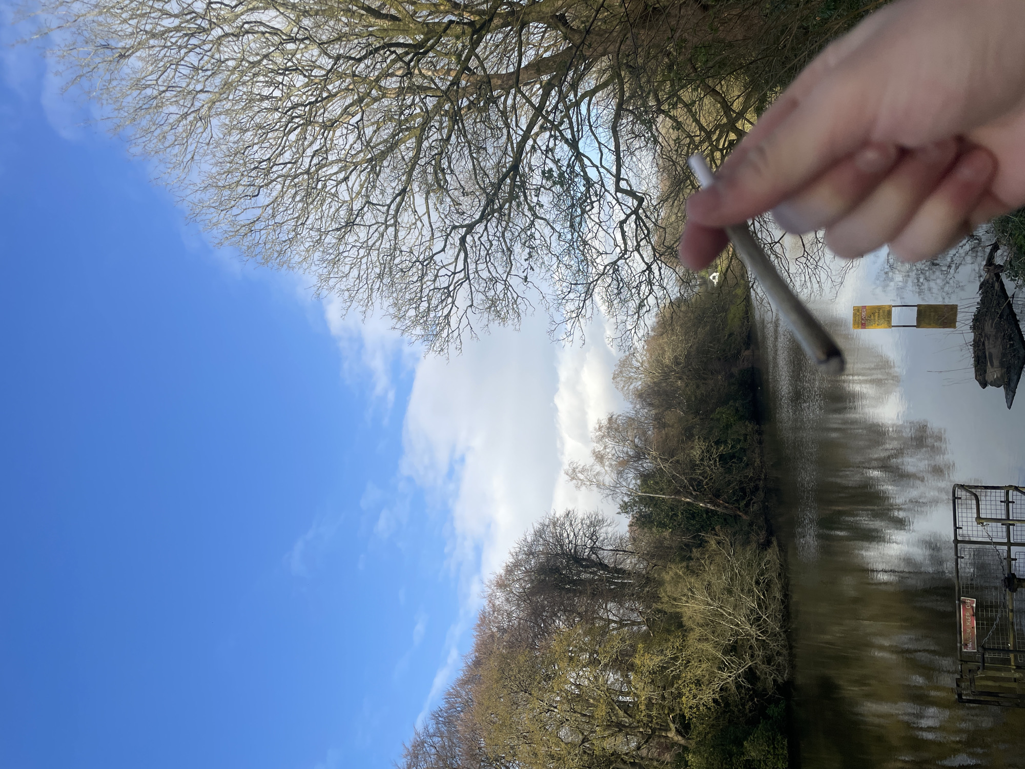 landscape scene with a body of water, possibly a lake or river, reflecting the sky and surrounding trees. The trees are mostly bare, suggesting it might be winter or early spring. A hand holding a rolled cigarette, or similar object, is visible on the right side of the image. There is a sign near the water, possibly a warning sign. The sky is blue with some clouds. The location is the city of Salford, United Kingdom.