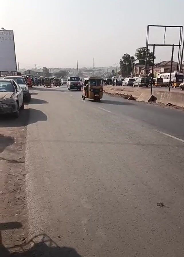 street scene, likely in an urban or suburban area. The road is paved and has multiple lanes. A few cars are parked on the left side of the road. There's a bus and several auto rickshaws, or "tuk-tuks," moving along the road. On the right side, there's what appears to be construction or road work, with concrete barriers lining the edge of the road. A large metal frame is visible on the right side as well, resembling a billboard structure. The sky is light, suggesting it's daytime. There are buildings and trees in the background. The overall impression is of a typical street scene with moderate traffic.