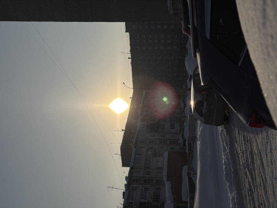 sunlit, winter scene. Buildings line a street covered in snow. Cars are parked on the snowy side. The sun, a bright square, shines in the sky. A lamppost is near the tall building. Wires stretch across the sky. The photo is taken with a tilt, possibly due to the camera's orientation or perspective.