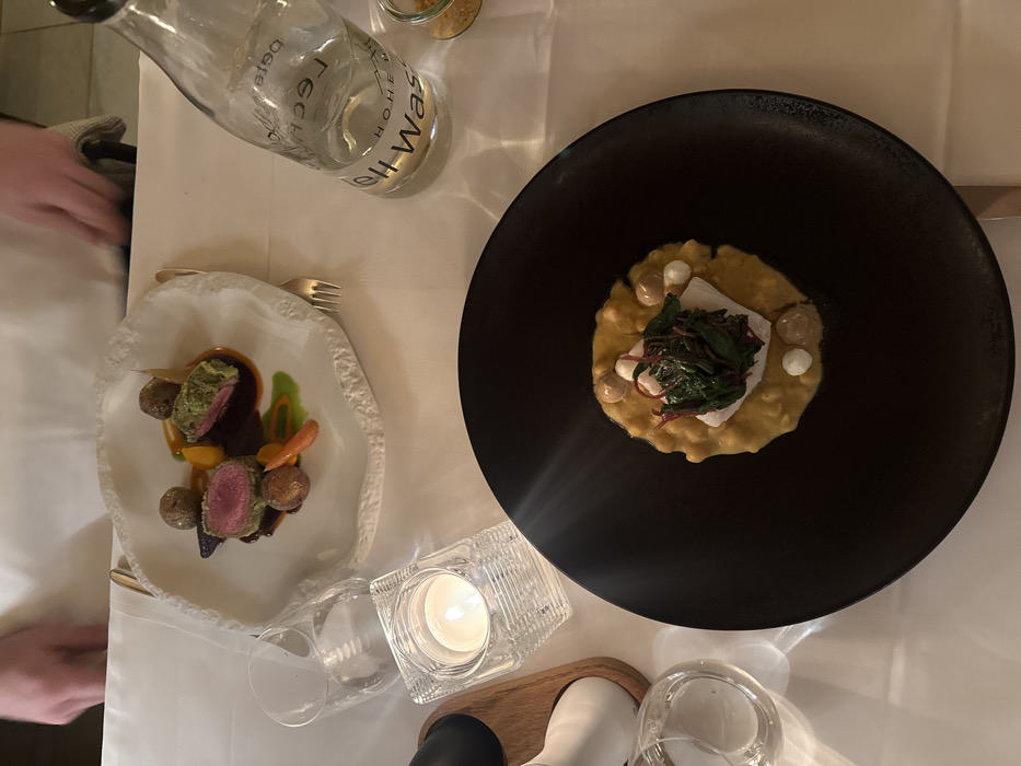 Two plates of exquisitely presented food sit on a white tablecloth alongside a water bottle, cutlery, and a candle. The left plate, irregularly shaped and white, contains meat, potatoes, carrots, and greens. The right plate, a large black circle, features a bed of yellow purée topped with white fish and dark leafy greens. Both dishes appear gourmet, with careful plating and attention to detail. The setting suggests a fine dining experience.
