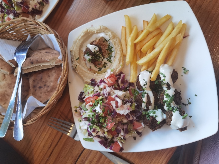 plate of food on a wooden table in Playa del Carmen, Mexico at the coordinates (20.625, -87.075). The plate contains a falafel dish with hummus, fries, a salad of shredded lettuce, red cabbage, tomatoes, and parsley, and four falafel balls topped with a creamy white sauce. There are two forks to the left of the plate and a third fork on the table near the plate. In the background, to the left of the plate, is a wicker basket containing pita bread. The pita bread is on top of a white napkin. There is also a plate with a salad in the background. The background is a wooden table. The photo was likely taken from a slightly elevated position.