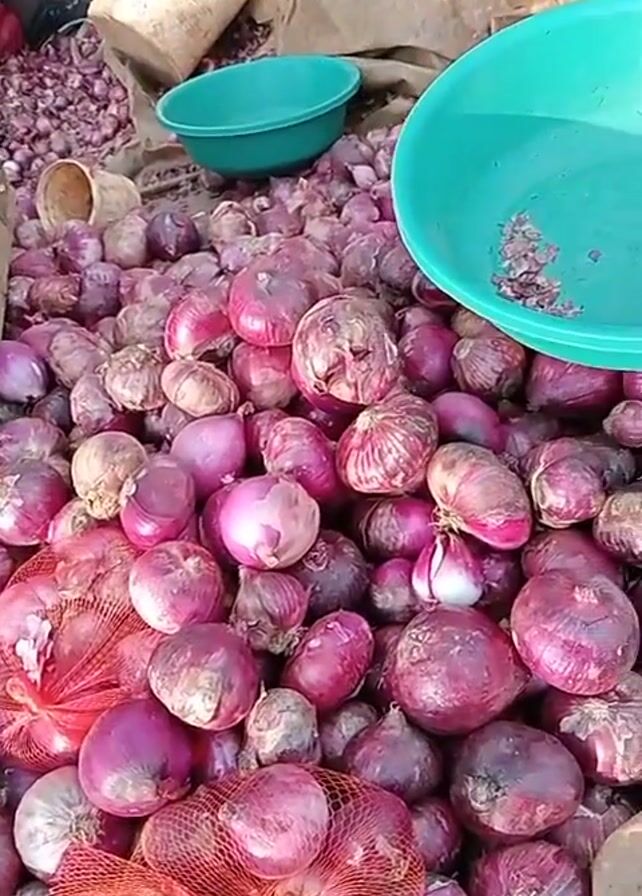large pile of red onions on a surface. Some onions are loose, while others are in red mesh bags. Two light blue plastic bowls are on top of the pile. A small, wooden crate is partially visible on the left side of the frame, and a bag of onions is behind the main pile. A man in a red shirt is sitting in the back of a vehicle, placing onions into an orange plastic crate.