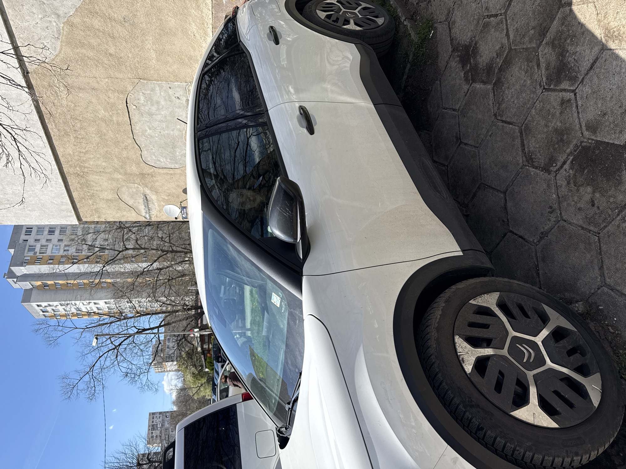 The image depicts a white Citroen C4 parked on a street in Sofia, Bulgaria