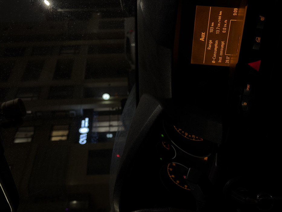 car's dashboard at night. A display panel indicates "Aux" mode, a range of 103 km, an average fuel consumption of 13.7 L/100km, and an instantaneous consumption of 0.0 L/h. The display also shows "28.0" and a time of 9:09. The dashboard includes controls for seat heating and "Sport" mode, with speedometer and other gauges dimly lit below the display. A building is visible through the windshield in the background.