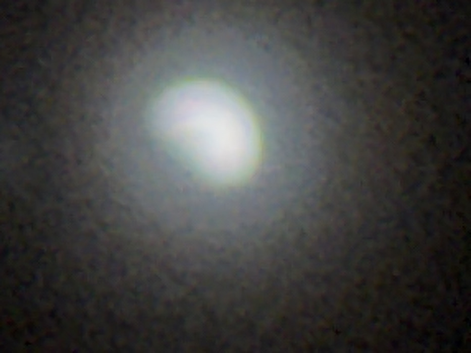 The image is a severely out-of-focus, low-resolution photograph, reportedly taken in Bischheim, France. It primarily features a bright, diffused, oval-shaped light source, slightly off-center towards the upper right. The light source exhibits a white to pale yellow core with a faint halo of green and yellow chromatic aberration around its periphery. The background is uniformly dark gray, mottled, and entirely out of focus, suggesting a low-light environment and indistinct textures. No specific objects, individuals, actions, or distinct environmental features are discernible within the abstract scene.