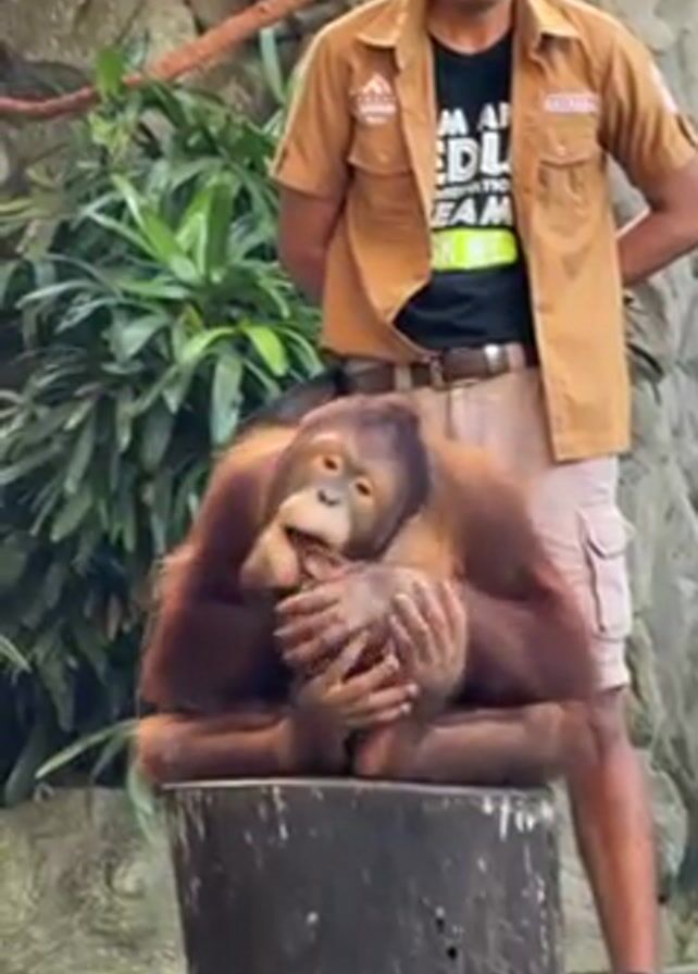 - "An orangutan sits on a short, thick, cut tree stump, in front of a man" by FM-PcEqo1, licensed under CC BY 4.0