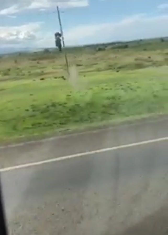 From inside a moving vehicle, a view of a rural landscape passes by. An asphalt road runs alongside a grassy field. In the distance, a lone dark object stands on the horizon, resembling a tree or perhaps a human figure. Overhead, a blue sky is partially obscured by puffy white clouds. A power line pole is visible near the edge of the field. The camera is shaky due to the movement of the vehicle, and some reflections are visible on the car window.