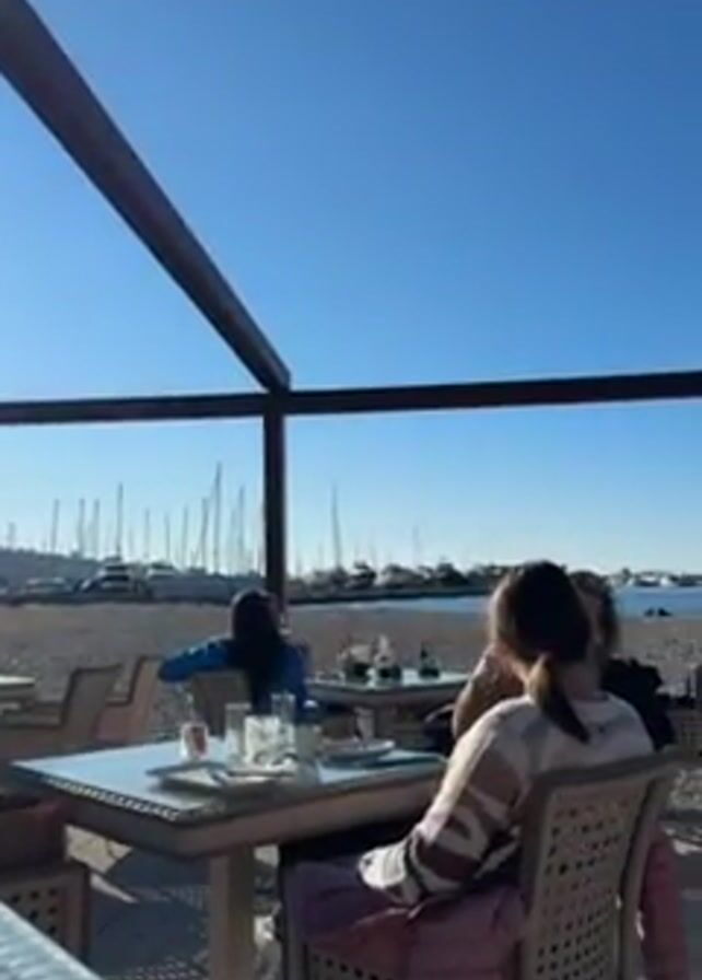 n outdoor restaurant patio with several people seated at tables. The patio has a pergola-like structure overhead. A clear blue sky is visible above. In the background, there is a harbor with numerous boats and yachts. The patio is next to a beach or shore. People are seated at the tables, appearing to be engaged in conversation or relaxation. The tables are set with plates, glasses, and cutlery. The general atmosphere seems calm and sunny.