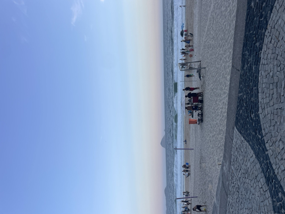 A beach scene with people scattered along the shoreline, enjoying the sand and surf. A distinct patterned walkway borders the beach, adding visual interest. The ocean stretches out to meet a soft, hazy sky. Sugarloaf mountain is barely visible in the horizon. The overall scene conveys a peaceful and relaxed atmosphere.
