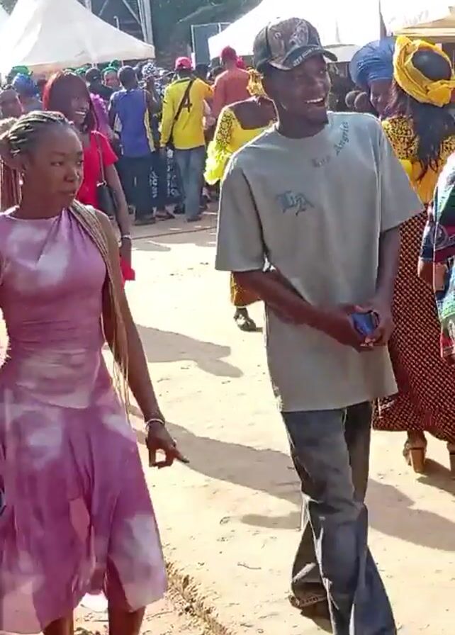 woman with braided hair walking through a crowded outdoor event. She is wearing a sleeveless pink and white tie-dye dress and sandals. Beside her walks a man with a baseball cap and a gray t-shirt. In the background, there are many people, tents, and at one point, someone carrying a drum. The ground is dirt and there are bits of trash scattered around.