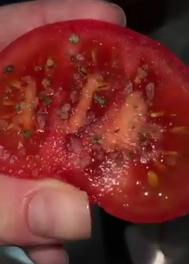 A person holds a slice of tomato with salt and herbs sprinkled on top. They then bring the tomato slice to their mouth, placing it inside and using their hand to cover their mouth while they chew. The image is slightly out of focus during the chewing.