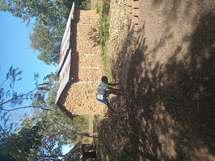 A young person stands near a building with walls constructed from mud or clay bricks and a rusted metal roof. The building is situated beside a brick-lined path or border. The surrounding landscape includes trees with lush green foliage and a clear blue sky in the background. Shadows cast by the trees are visible on the path.