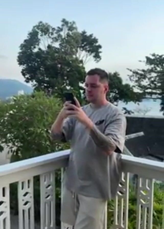 A man with short brown hair and tattoos on his arms stands on a white balcony, facing the camera and holding a phone. He is wearing a gray t-shirt and light-colored shorts. He looks at the phone, then looks up at the camera and points. Behind him are green trees, a white building with a dark roof, and the ocean. The sky is a light blue color.