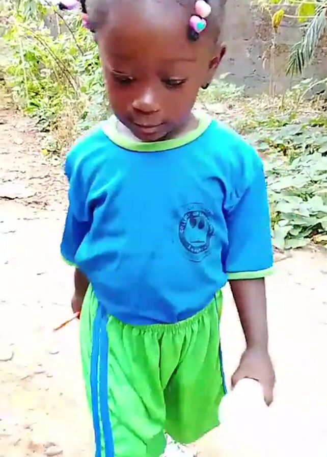 A small child stands outdoors on a dirt path. She has black hair with short, twisted braids adorned with colorful beads. She wears a blue short-sleeved shirt with a green collar and a logo on the chest, green shorts with blue stripes down the sides, and black and white sneakers. She holds a small orange and red object in her left hand. She looks down, then turns her head to the right. The background shows green foliage and hints of a fence or structure.