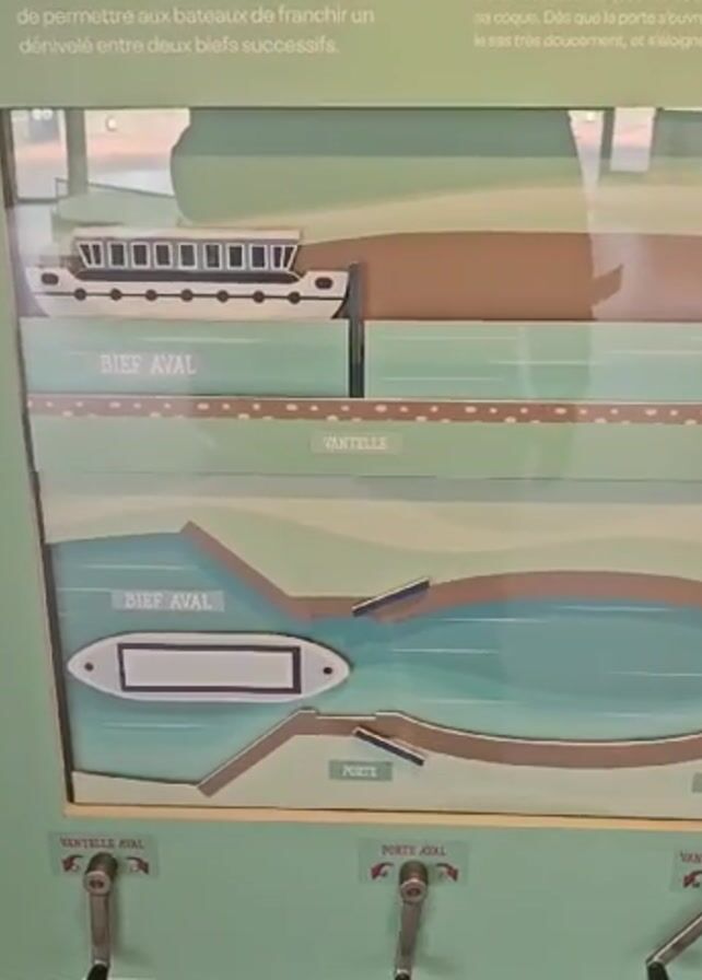 static shot of a demonstration display in an educational setting. The display illustrates how a canal lock works. The image shows three sections. The top section displays a boat on a section of the canal labeled "Bief Aval". Underneath this is a canal section with a boat inside. It is labeled "Bief Aval". At the bottom of the display are three levers labeled "Vantelle Aval", "Porte Aval", and "Vantelle Amont". The display has a clear cover over it. There are some reflections on the clear cover. The background appears to be indoors with a brick wall visible.