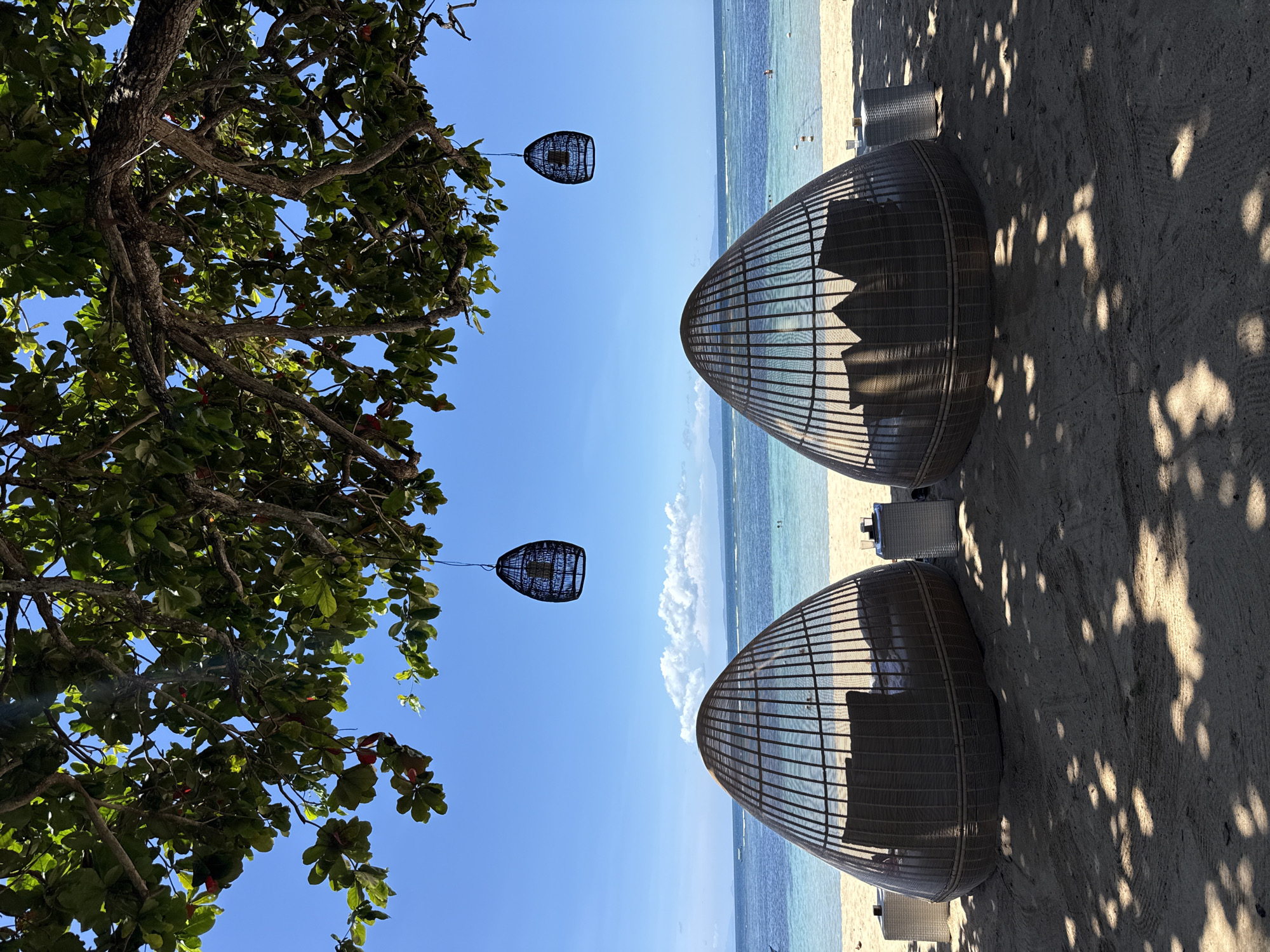 The image depicts a beach scene in Nusa Dua, Indonesia, with a clear blue sky and turquoise ocean. In the foreground, two large, dome-shaped wicker beach loungers sit on the sand, casting shadows. A leafy tree branch extends into the frame from the left, adorned with two hanging wicker lanterns. The beach is sandy, and the ocean stretches out to the horizon. The scene captures a tranquil, tropical atmosphere.