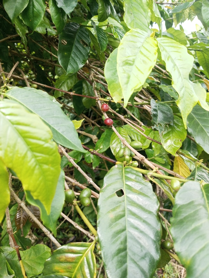 The image depicts a close-up view of a coffee plant in Abbireddygudem, India