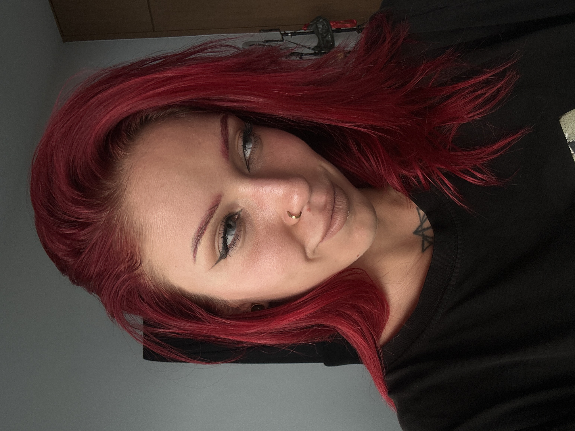 This image captures a female individual indoors in Kerobokan, Indonesia. The subject, viewed from the chest up and slightly off-center to the left, has long, vibrant red hair parted on her left side. Her light blue or grey eyes are directed towards the viewer's lower right, featuring prominent black winged eyeliner and reddish-colored, shaped eyebrows. A small gold-colored hoop pierces her right nostril. Her lips are a light nude tone, with the right corner of her mouth slightly lifted in a smirk. A small metallic adornment is visible below the center of her lower lip. Her visible left earlobe contains a black circular ear plug. She wears a black crew-neck t-shirt, and a geometric tattoo is present on her upper left chest/collarbone area. The background on the viewer's left is a plain grey wall. On the viewer's right, a brown wooden cabinet or door is partially visible, along with a dark, indistinct object and a hanging dark bag positioned behind her right shoulder.