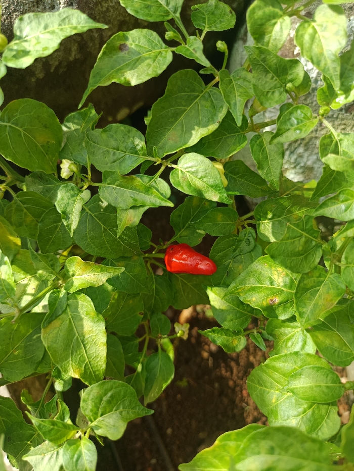 A single red chili pepper, approximately 2-3 cm in length and conical in shape, is depicted growing on a plant in Palasari, Indonesia