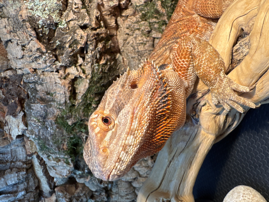 A single bearded dragon (Pogona vitticeps) is depicted in a close-up, situated within an artificial enclosure. The reptile exhibits an orange and tan coloration with textured scales and prominent spikes along its head, body, and the "beard" area beneath its chin. Its right eye is visible, featuring a dark pupil within an amber iris. The bearded dragon is resting on a light-colored, gnarled wooden branch, with its head slightly elevated and oriented towards the left. Its front right foot, equipped with visible claws, grips the branch. The background consists of rough, dark brown and gray cork bark, marked with crevices and interspersed with small patches of green moss or lichen. In the lower-left corner, a dark, textured mat or substrate is visible, partially obscured by the branch, alongside a smooth, light-colored stone. The scene provides no visual information to determine a specific city location in Yakhroma, Russia.