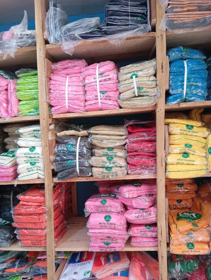 The image displays an interior view of a retail or storage space in Barikin Jirga Summa, Nigeria. The scene is dominated by multiple vertical wooden shelving units, constructed from light-colored, unvarnished wood. These shelves are densely packed with numerous bundles of textile products, predominantly folded garments or fabric pieces, neatly arranged by color. Each bundle is individually wrapped in clear plastic, and many feature white labels with green accents, prominently displaying "MADE IN INDIA" along with care symbols. Specific brand names such as "SM," "KMT," "EM-FOLD," and "KAMIZA" are visible on some labels. The bundled items exhibit a diverse color palette, including significant quantities of pink, light green, beige/khaki, light blue, yellow, orange, red, and black textiles. The bundles are stacked several deep on each shelf. A light blue painted wall is visible in the background behind the shelving units. No individuals, actions, or interactions are present in the frame.