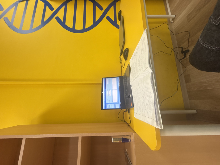 The scene depicts an indoor study or workspace located in the city of Kardzhali, Bulgaria. The room features vibrant yellow walls, with a large blue DNA double helix graphic prominently displayed on the right wall. The floor is covered with light wood laminate. A yellow desk with white legs occupies the central and right portions of the image. To the left, a light wood-colored shelving unit is visible, containing a silver and blue Red Bull energy drink can on one of its lower, empty shelves. On the yellow desk, an open black laptop is powered on, displaying a software interface with multiple fields and buttons, predominantly in blue and grey tones. An open white notebook, filled with handwritten black ink, lies directly in front of the active laptop. A black computer mouse is positioned to the right of the laptop. Further to the right and slightly behind the active laptop, a second, closed dark-colored laptop or tablet is visible. Multiple black cables are draped across the desk and extend towards the floor, connecting the electronic devices. In the lower right corner of the frame, a person's legs, clad in dark denim jeans with visible light stitching, indicate an individual is seated at the desk.