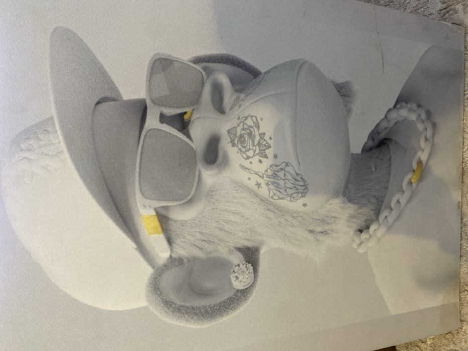 This image, located in Giginyu, Nigeria, depicts a digitally rendered anthropomorphic ape. The subject is primarily grayscale, exhibiting textured fur on its head and ears, contrasted with smoother skin on its muzzle. It wears a white baseball cap with the brim oriented backward and white-framed rectangular sunglasses with yellow accents on the temples. A single, round, faceted stud earring is visible in its left ear. The ape's muzzle features two stylized tattoos: a skeletal hand giving a middle finger gesture, surrounded by small stars, on the left side; and a rose design, also with small stars, on the right side. Around its neck, a chunky white link chain necklace with a single central yellow link is present. A white garment, appearing to be a t-shirt, is visible below the necklace. The background is a uniform white, devoid of additional context or objects. The image itself appears to be a photograph of a print or screen display, showing subtle surface textures and minor linear imperfections.