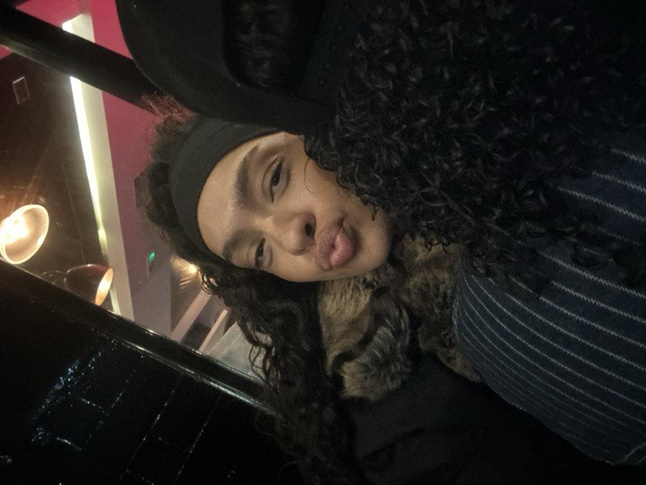This image depicts two individuals situated inside a commercial establishment in London, United Kingdom. The primary subject, a female with dark, curly hair and a medium-dark complexion, occupies the foreground. She is wearing a black headband and a dark jacket featuring a brown, fur-lined collar. Her face is directed slightly towards the viewer, with her lips deliberately pursed into a puckered expression and her right eye partially squinted. A second individual is partially visible to the right, identifiable by dark, curly hair or dark headwear. The immediate background on the left consists of a dark, reflective surface. Above the subjects, two illuminated pendant light fixtures are visible, one featuring an exposed bulb and the other a conical shade. Beyond these fixtures, the distant background is blurred, showing areas with distinct pink and purple ambient lighting, consistent with an interior commercial space such as a restaurant or bar.