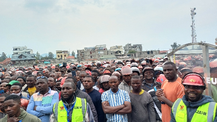The image displays a dense gathering of several hundred adult men in Goma, Democratic Republic of the Congo, situated outdoors under an overcast sky