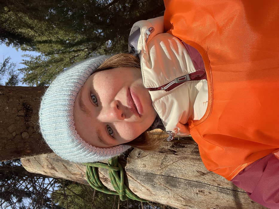A female individual is depicted in a close-up, upward-angled selfie taken outdoors in what appears to be a coniferous forest in Сергино, Russia. The subject, a young adult with fair skin and light-colored eyes, wears a light blue knitted beanie, a cream-colored collared jacket with maroon accents, and a bright orange garment over the jacket, with a maroon sleeve visible on the left. Her expression is neutral to slightly smiling, and she is looking directly at the camera. To the left of the subject, a thick green rope is visible, wrapped around the trunk of a large tree with rough bark. Tall evergreen trees are visible in the background against a clear blue sky, indicating bright sunlight.