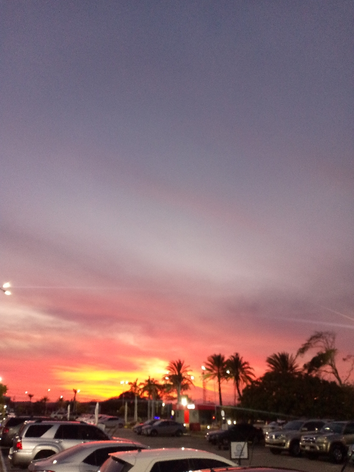 The image captures a sunset scene over a parking lot in La Cruz del Pastel, Venezuela, during the evening twilight
