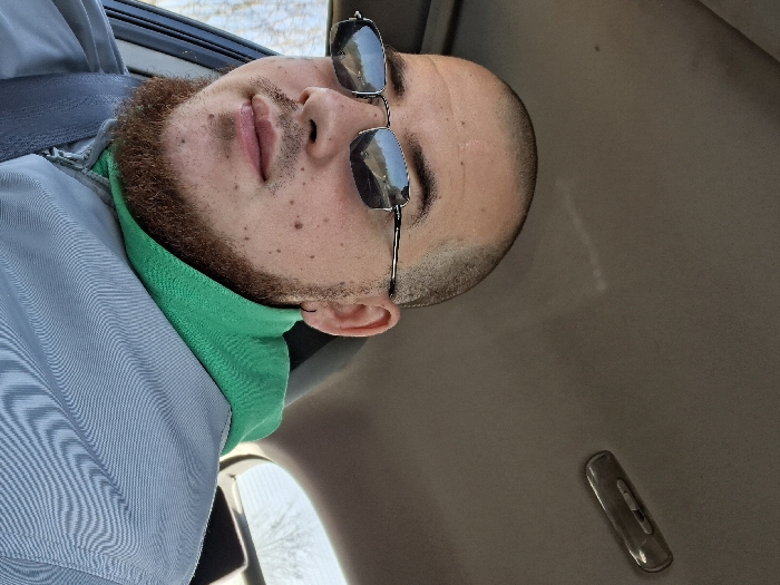The image displays a male individual seated within the interior of a vehicle