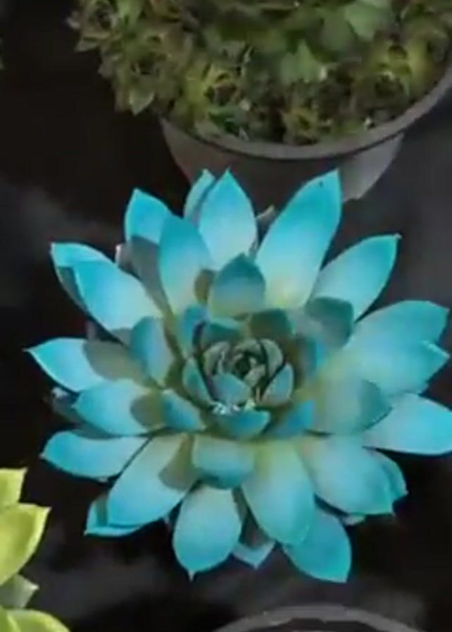 selection of potted succulents. A large succulent in the center of the frame has been artificially colored a bright aqua-blue. The camera zooms in to provide a closer view of the succulent’s petals and the intricate pattern they form. Other succulents in varying shades of green are visible in the background.
