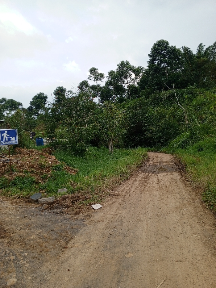 The image displays an unpaved dirt road in Thotagamuwa, Sri Lanka, under an overcast sky. The light brown road, marked by visible tire tracks and dark, damp sections, extends into the mid-ground, curving gently to the right. On the left side of the road, a blue rectangular sign on a pole features white pictograms depicting a walking person and a dog, with the text "PEJALAN KAKI" printed below. Adjacent to the sign is a mound of brown earth and miscellaneous debris. Further to the left and slightly behind, partially obscured by dense green vegetation, a blue cylindrical container is visible. The right side of the road is bordered by thick green grass and bushes, leading up a densely forested hillside populated by numerous broadleaf trees, some tall with prominent trunks. The upper portion of the image shows a cloudy, light grey sky. No individuals or animals are present in the scene.