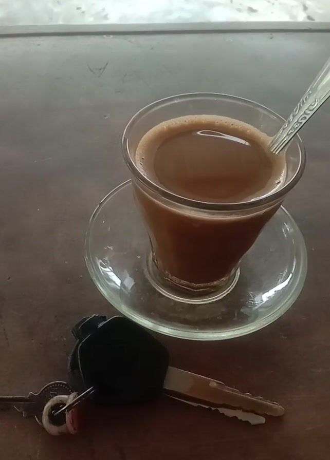A high-angle shot shows a glass cup of coffee on a clear saucer. A small spoon is inside the cup. Next to the cup are car keys. A hand reaches into the shot and stirs the coffee with the spoon. The surface below the cup and keys is a dark, slightly reflective color. Outside the frame, speech in another language is audible.