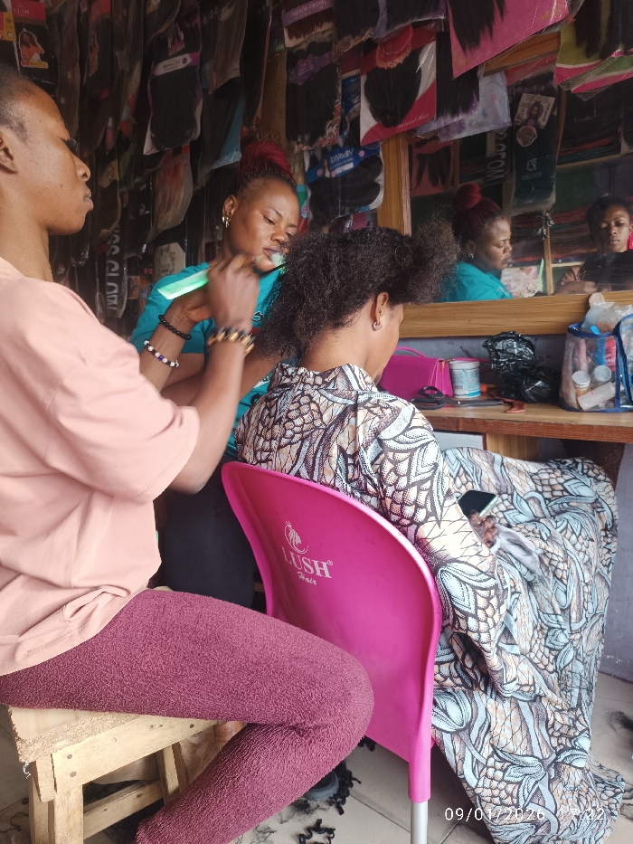 - "Inside a hair salon, a woman with a red-tinted bun is seen combing another woman's hair" by FM-i4swL2, licensed under CC BY 4.0